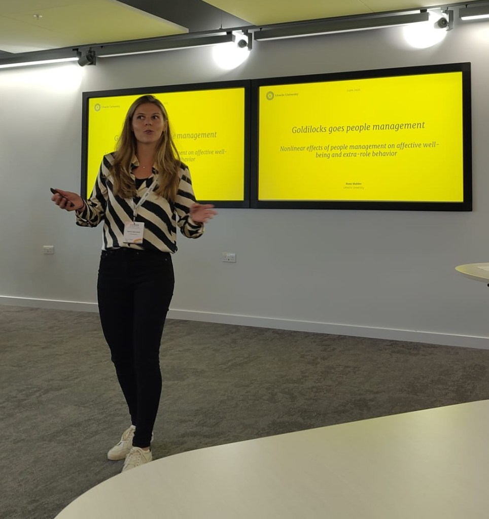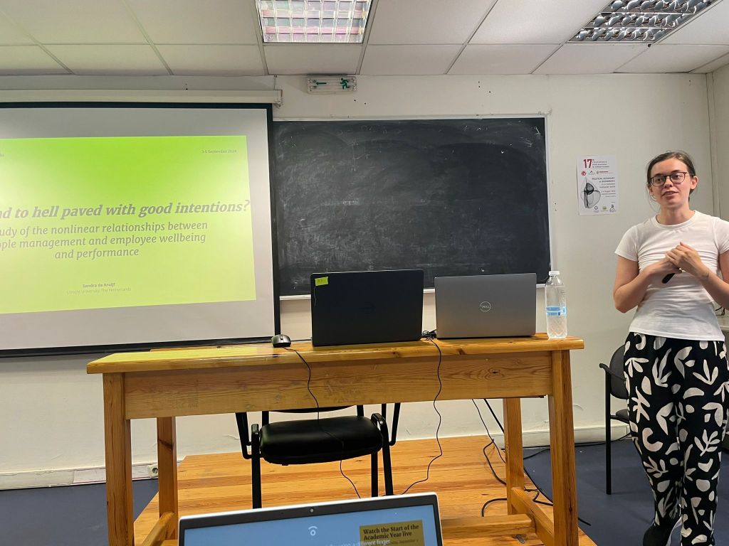 Sandra shared the setup of her quantitative study, co-authored with Eva Knies, Julia Penning de Vries and Toon Taris, on the nonlinear relationships between people management and employee wellbeing and performance. Stay tuned to find out if the road to hell is paved with good intentions.