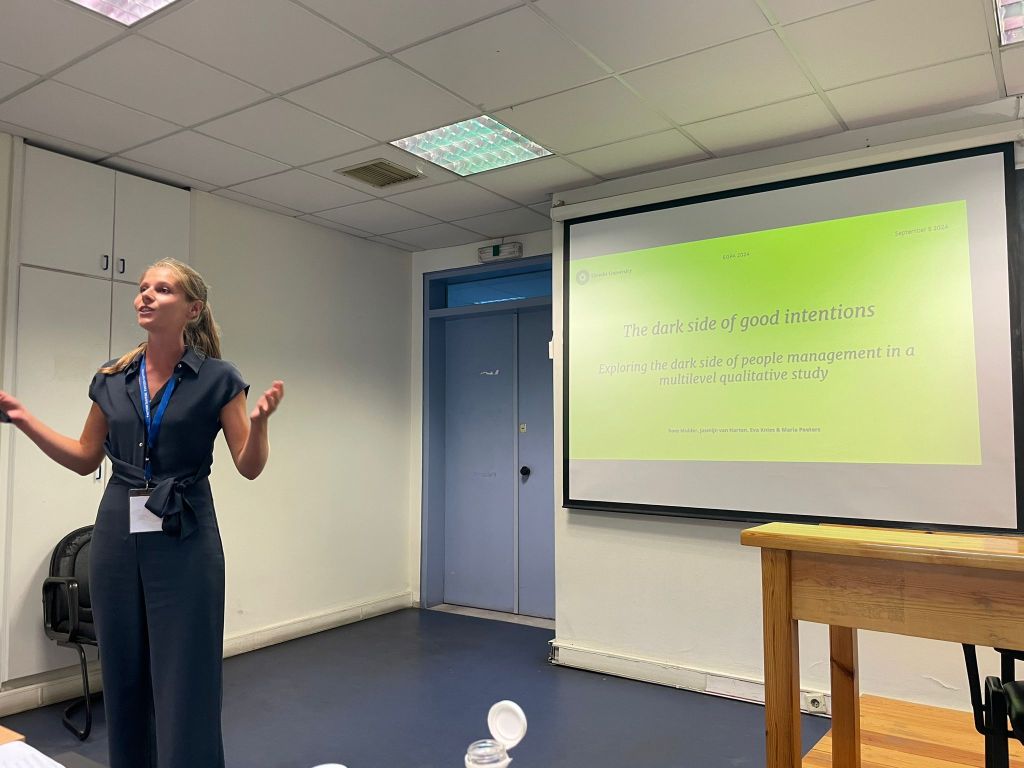 Roos presented her qualitative paper, co-authored with Eva Knies, Jasmijn van Harten and Maria Peeters, based on 55 in-depth interviews from which 6 manifestations of the dark side of people management were distilled. She introduced us to overly enthusiastic, clumsy, etc. people management.